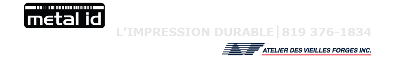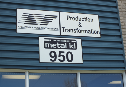 L’Atelier des Vieilles Forges par le biais de son département de production et transformation a fait l’acquisition, en 2013, de Métal Identification (Metal ID) une entreprise de Chicoutimi qu’elle a déménagée à Trois-Rivières. Métal ID offre un produit exclusif dans la région, la fabrication et l’impression de plaques d’identification et d’étiquettes avec code à barre sur aluminium. Notre procédé unique d’impression dans l’aluminium anodisé garanti une durabilité de 20 ans contre l’effacement. Métal ID propose aussi un service de gravure au laser sur une variété de matériaux (acier inoxydable, verre, aluminium, lamicoïde (gravoply), céramique, autres) et de gravure mécanique. Tous ces nouveaux produits viennent s’ajouter à notre gamme de produits d’impression.